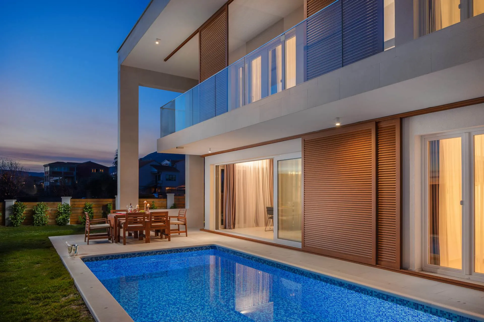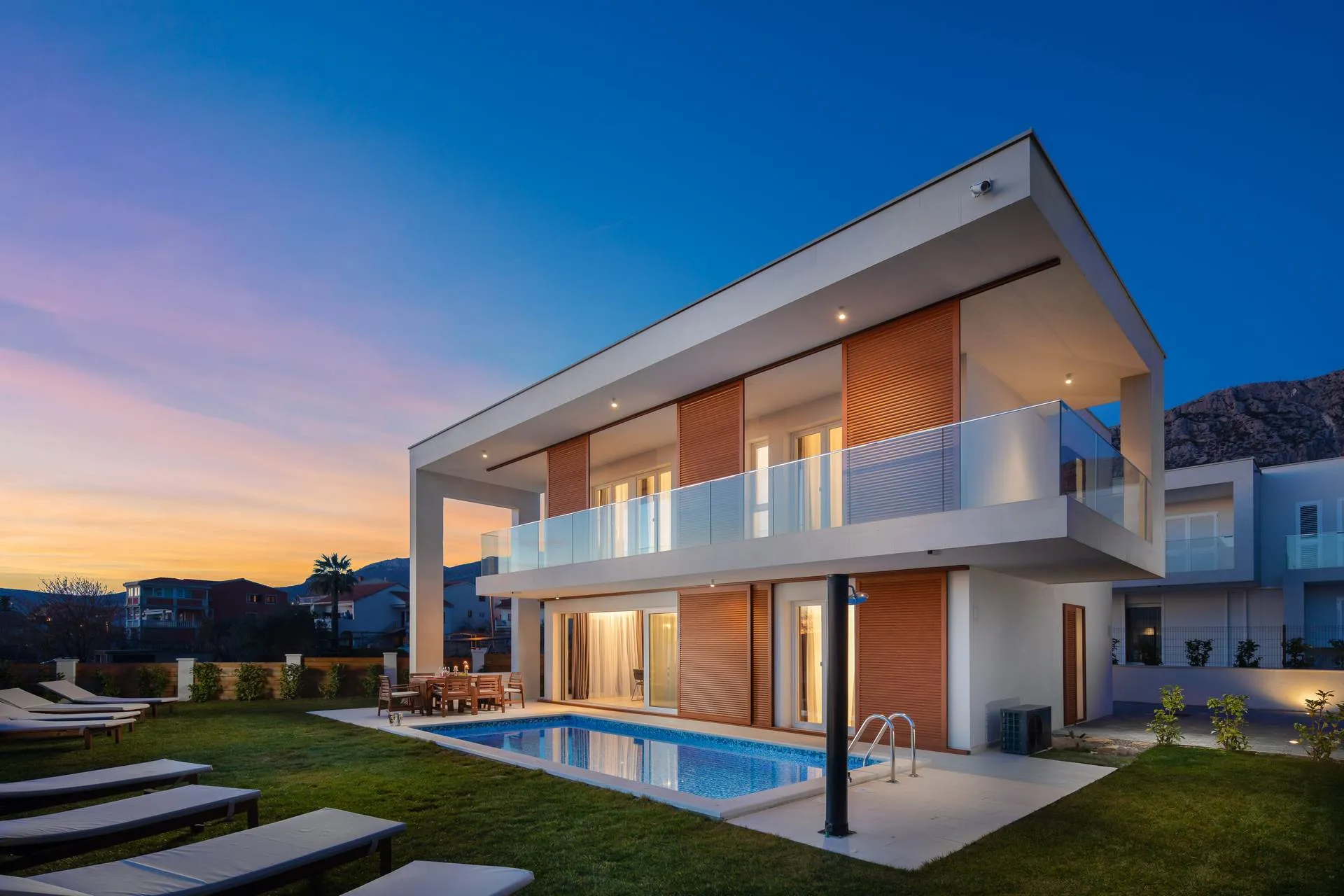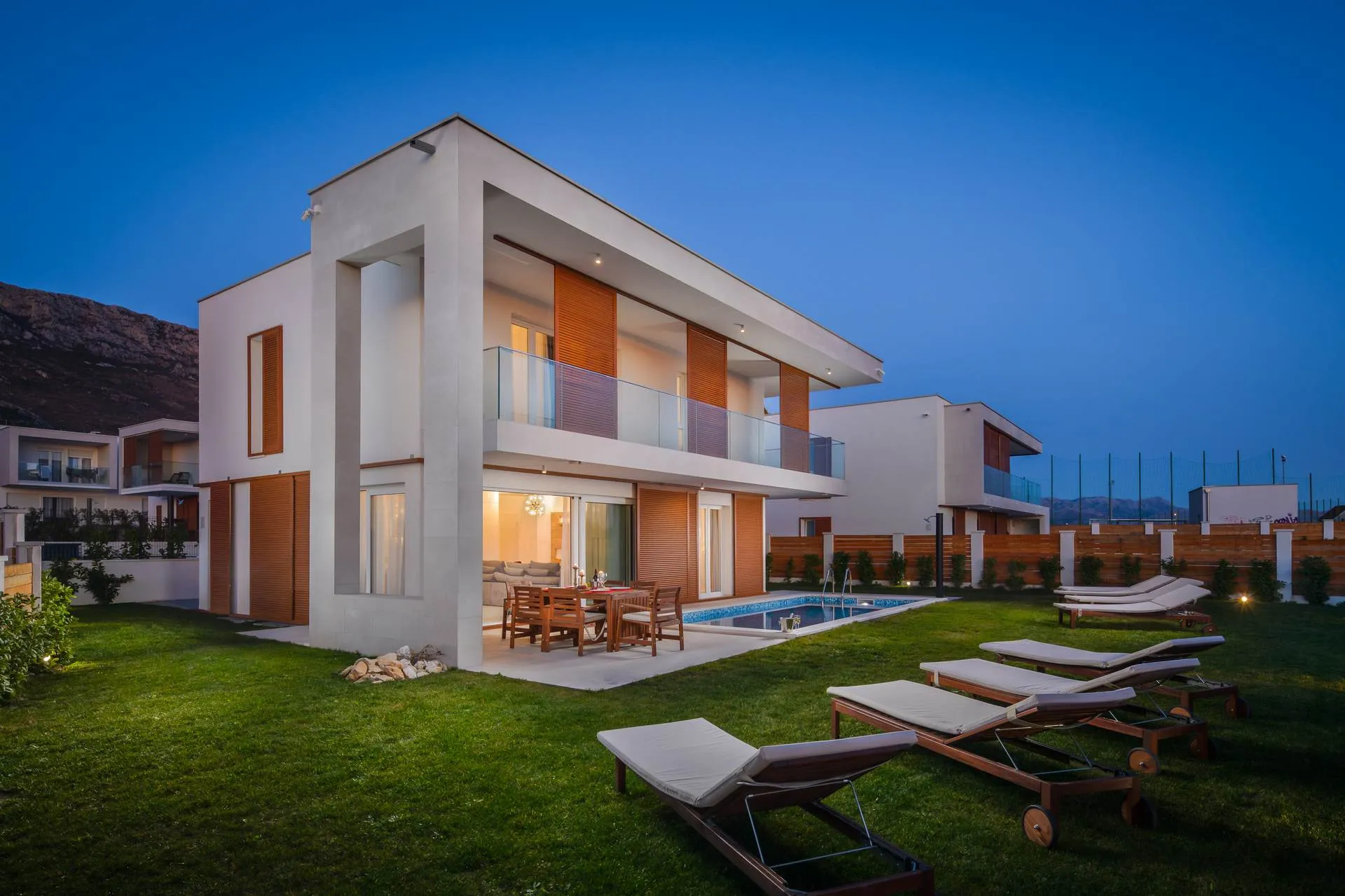 On the outside there is a seawater pool. Sun loungers and an outdoor shower are at your disposal. Also, for pleasant moments outdoors, there is a dining area for 8 people. The property is completely fenced and you will be able to enjoy privacy without worries.